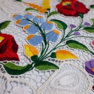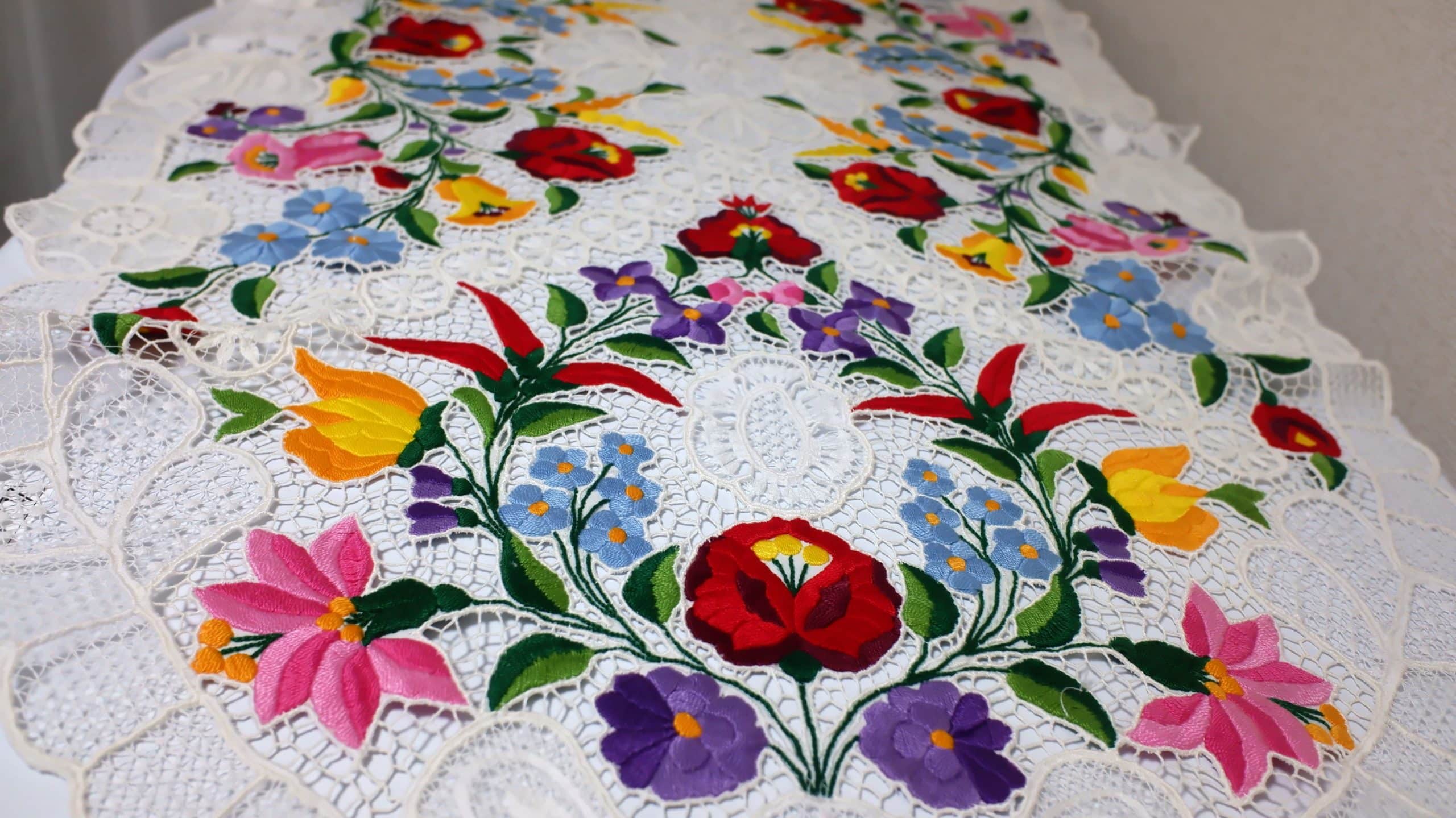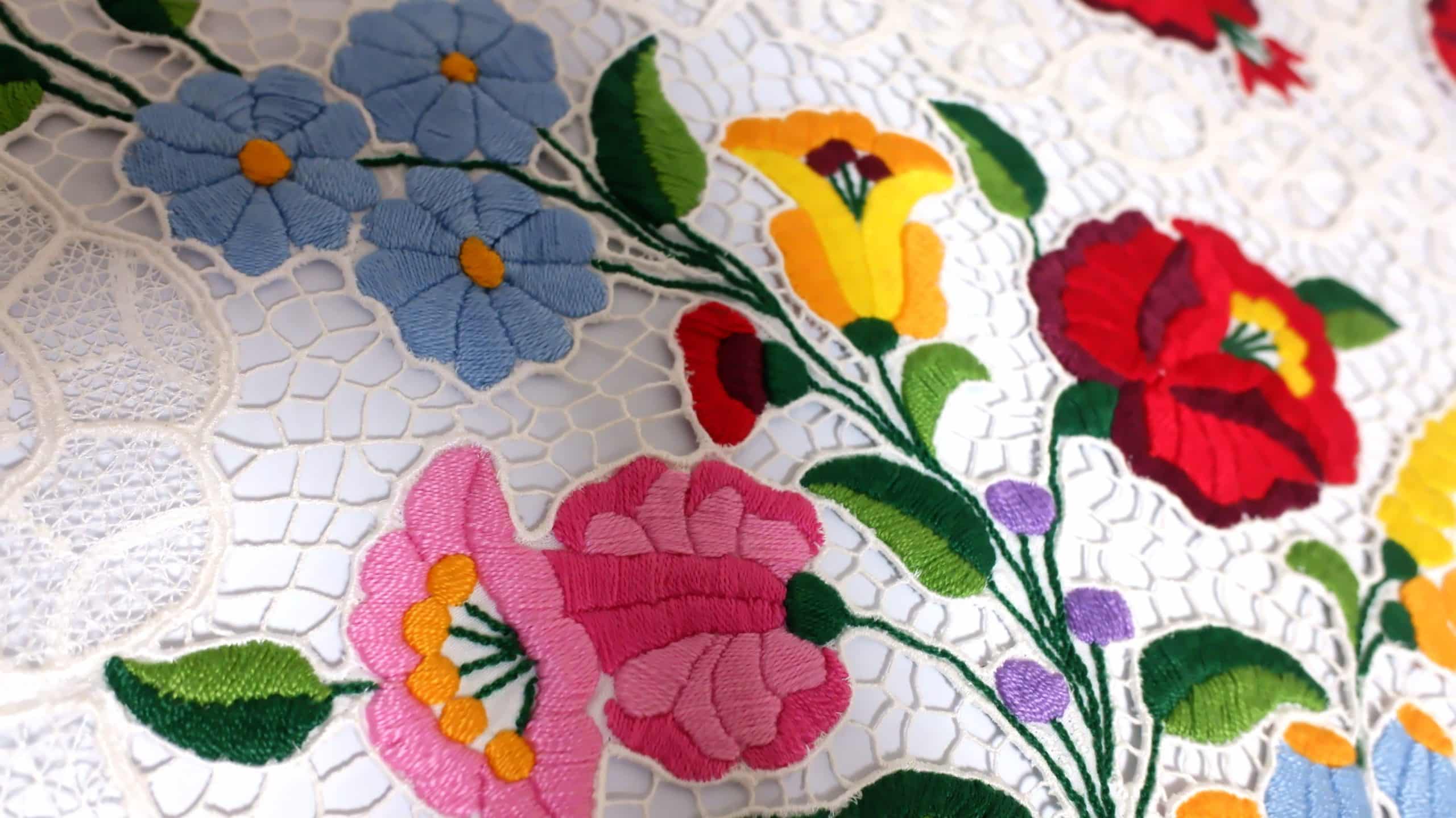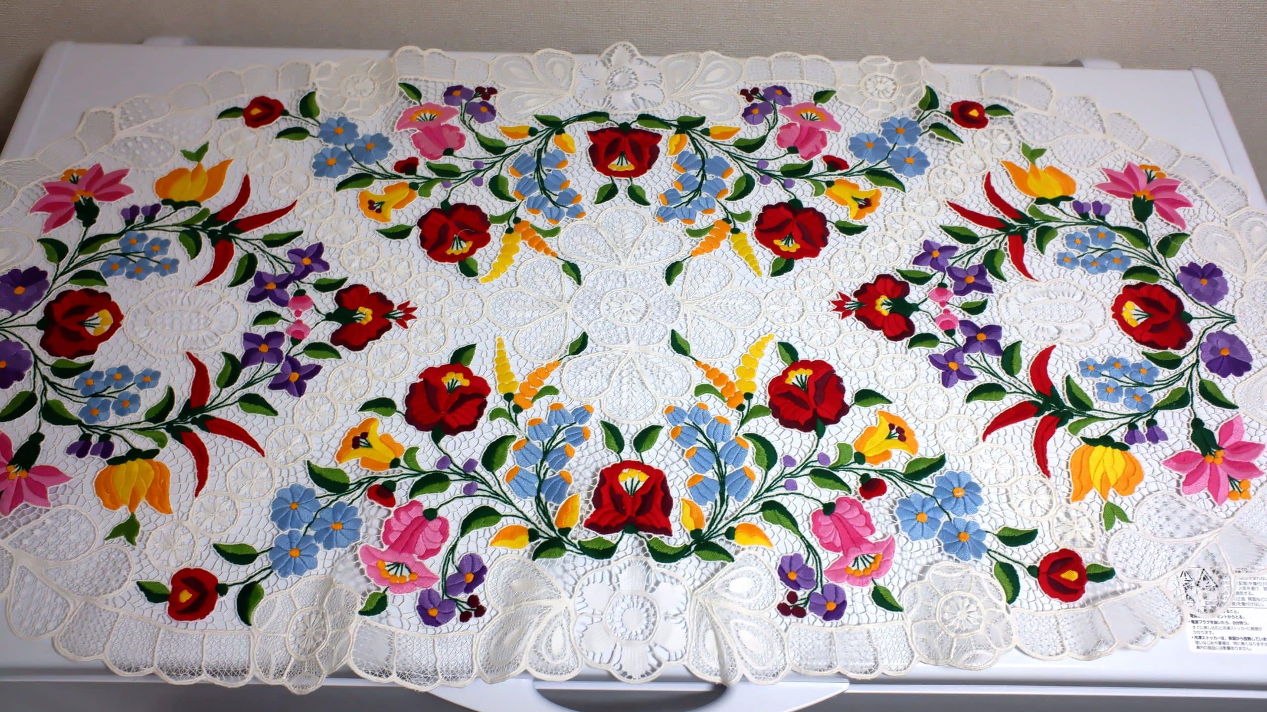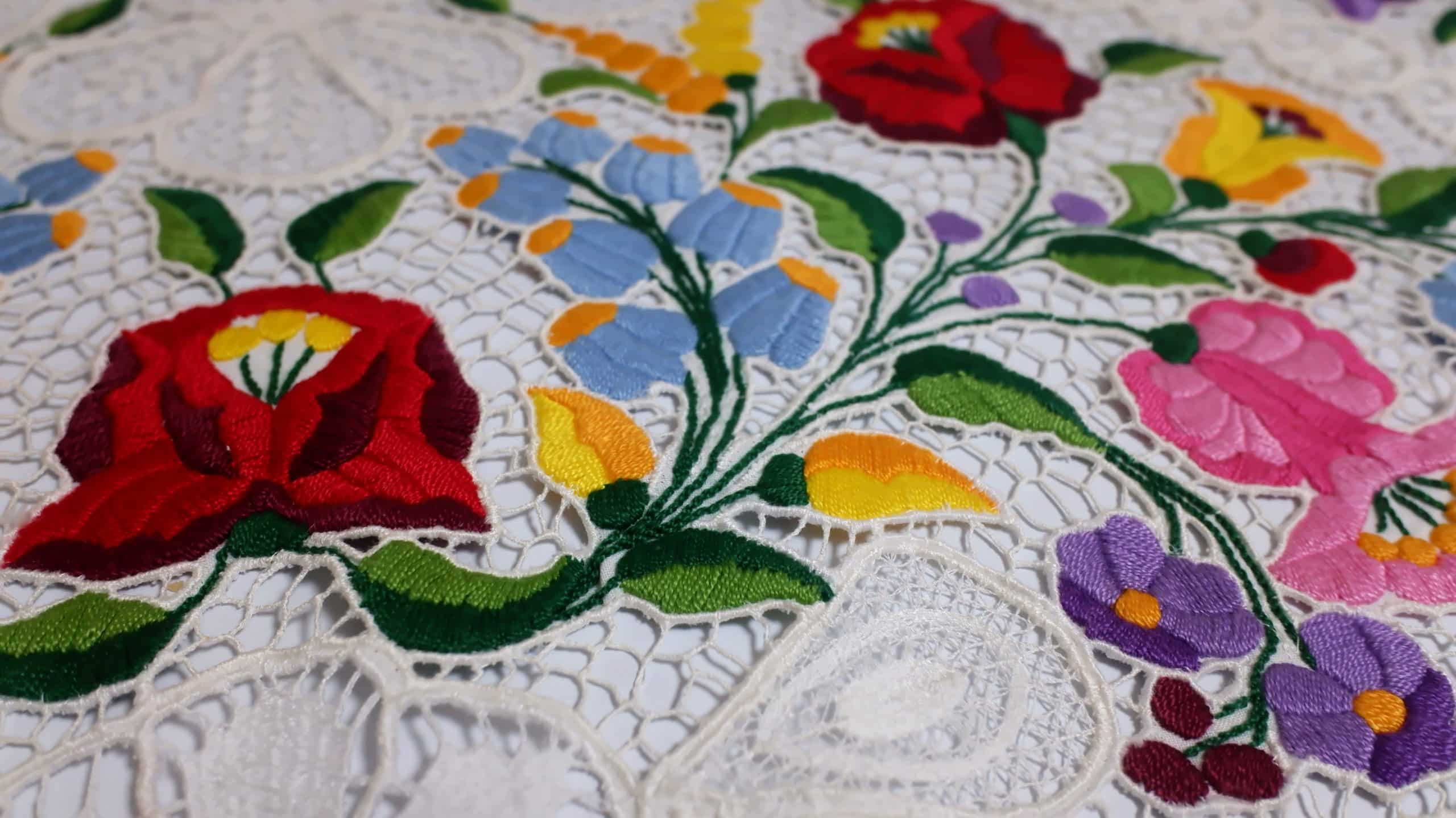 カロチャ刺繡の最も特徴的な要素は、白い布地に刺されたカラフルな花々や葉のチモーフです。ばら、チューリップ、ポピー、ひまわりなどの植物がデザインに使われ、赤、青、緑、黄色、紫といった鮮やかな色彩が組み合わさることで、華やかで生命力あふれる印象を与えます。