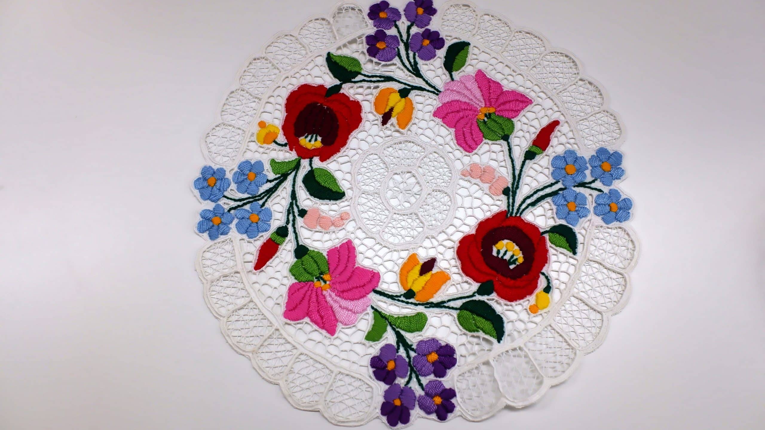 カロチャ刺繡の最も特徴的な要素は、白い布地に刺されたカラフルな花々や葉のチモーフです。ばら、チューリップ、ポピー、ひまわりなどの植物がデザインに使われ、赤、青、緑、黄色、紫といった鮮やかな色彩が組み合わさることで、華やかで生命力あふれる印象を与えます。