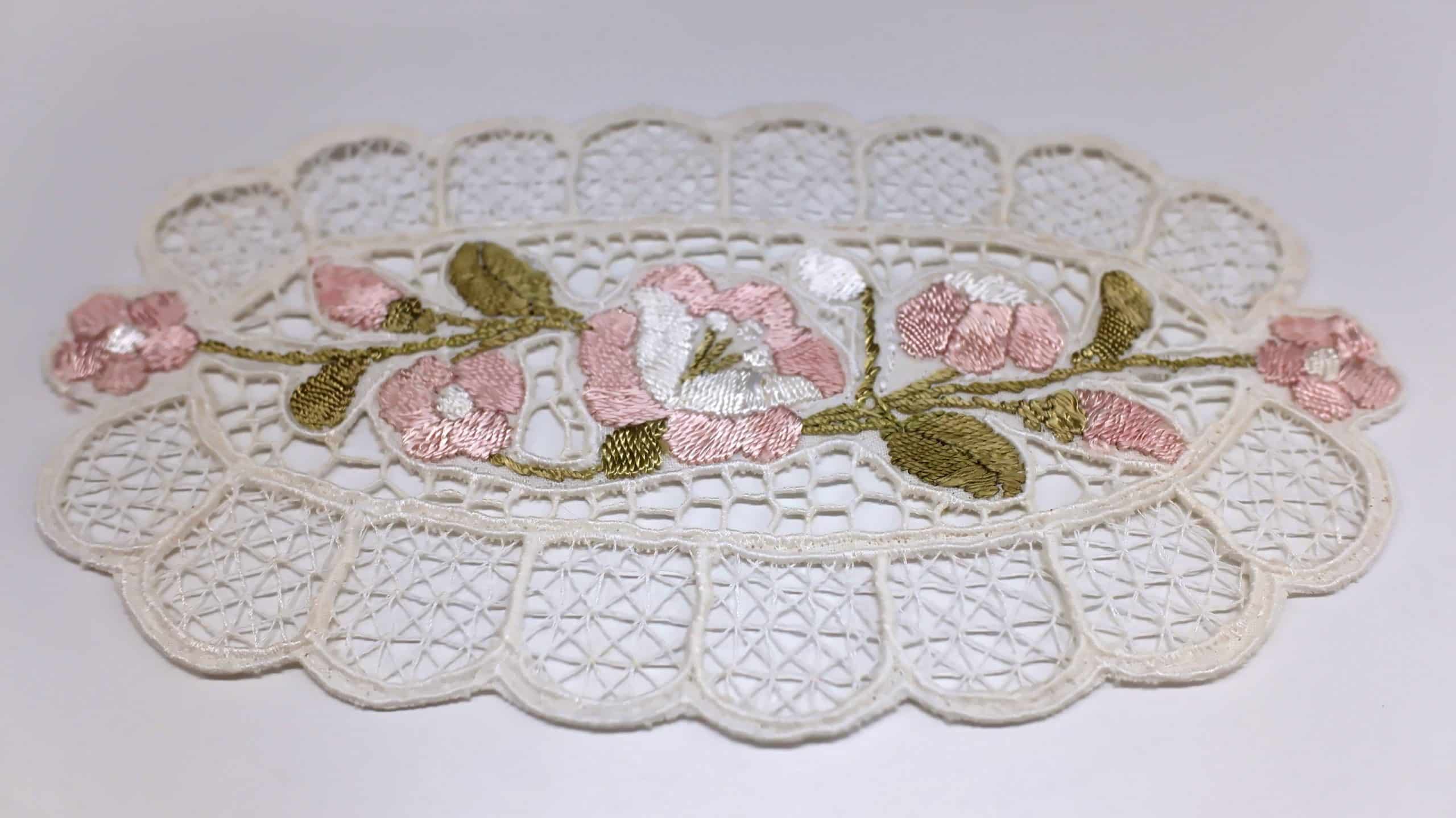 カロチャ刺繡の技法は手作業で、一針一針丹念に縫い進めることが重要とされています。基本的なステッチ技術は、サテンステッチやチェーンステッチが用いられ、布全体にわたって、繊細な膜様が広がります。