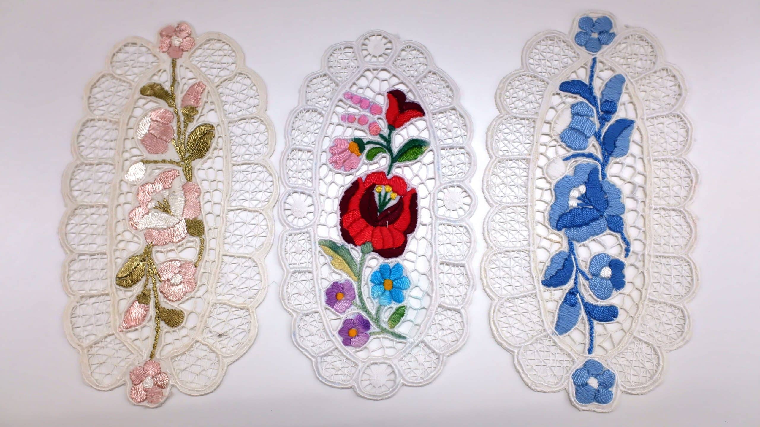 カロチャ刺繡の最も特徴的な要素は、白い布地に刺されたカラフルな花々や葉のチモーフです。ばら、チューリップ、ポピー、ひまわりなどの植物がデザインに使われ、赤、青、緑、黄色、紫といった鮮やかな色彩が組み合わさることで、華やかで生命力あふれる印象を与えます。
