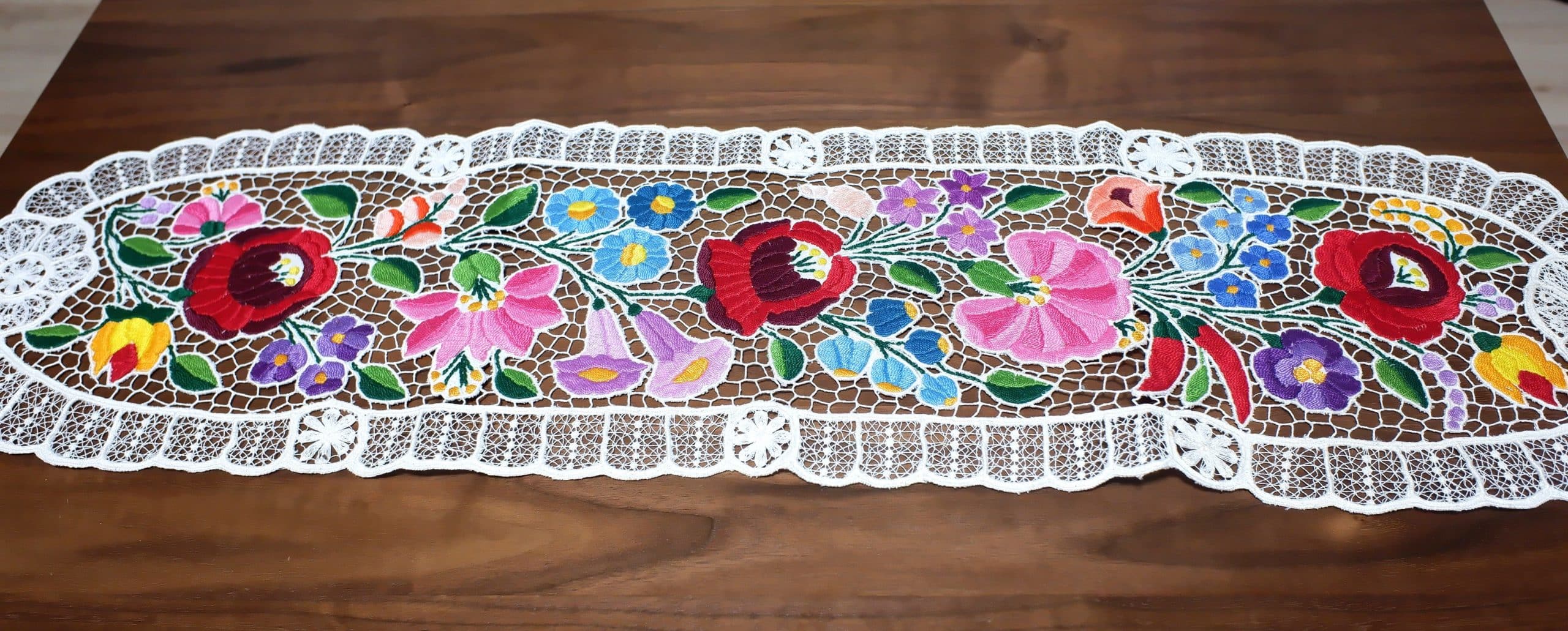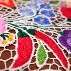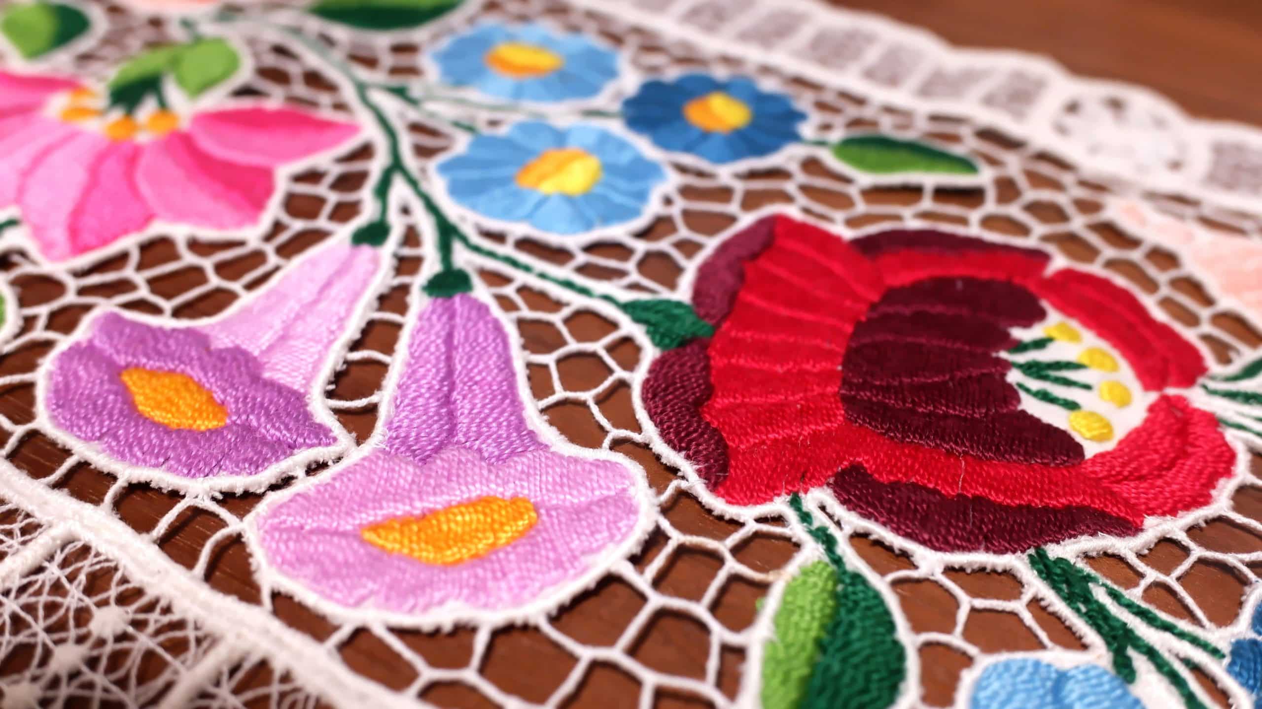 カロチャ刺繡の最も特徴的な要素は、白い布地に刺されたカラフルな花々や葉のチモーフです。ばら、チューリップ、ポピー、ひまわりなどの植物がデザインに使われ、赤、青、緑、黄色、紫といった鮮やかな色彩が組み合わさることで、華やかで生命力あふれる印象を与えます。