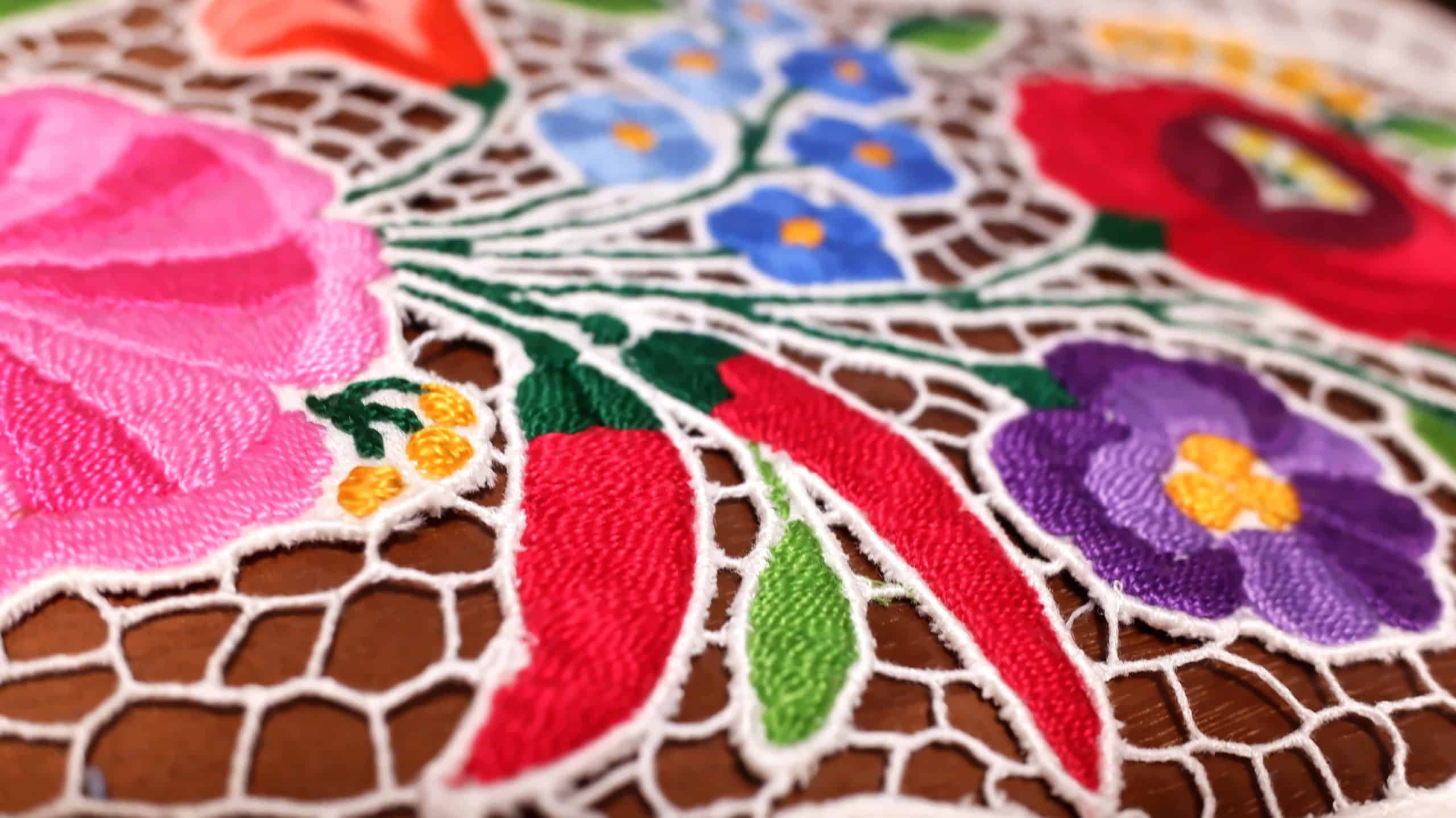 カロチャ刺繡の技法は手作業で、一針一針丹念に縫い進めることが重要とされています。基本的なステッチ技術は、サテンステッチやチェーンステッチが用いられ、布全体にわたって、繊細な膜様が広がります。